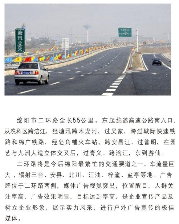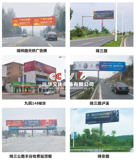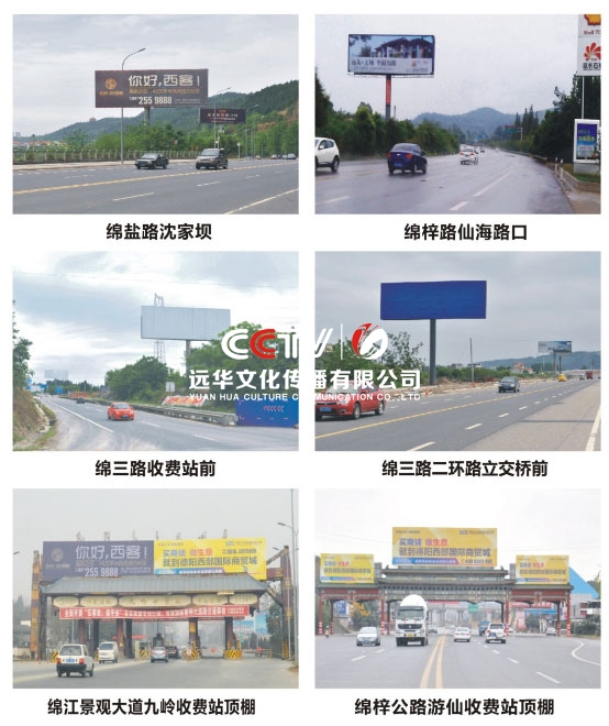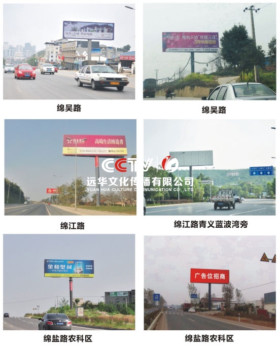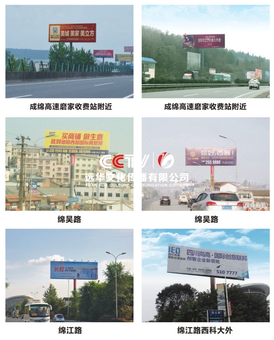 公司擁有單立柱及戶外大牌100余個,分布在成綿高速磨家收費站、綿鹽路、綿三路、綿江路、綿梓路、綿陽農科區、綿安路、科學城、二環路等。可應客戶需求建立、審批、發布戶外單立柱廣告牌。