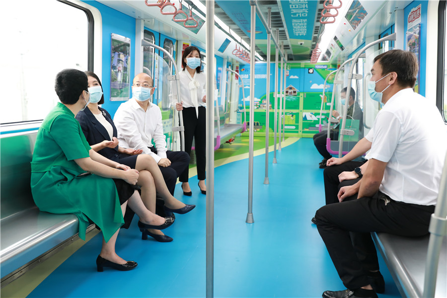 隨著大屏展開,“香城號”社區旅游主題列車映入眼簾。“香城號”主題列車,北起新都、穿城而過、南至雙流的 5 號線運行,以新都區鄉村振興代表項目--“珠鏈錦繡”為主題,由 8 節車廂組成,首尾車廂為“珠鏈錦繡”項目的序章,像一本書的序章,提綱挈領地展現景區特色網紅打卡點;中間六節車廂則按“珠鏈錦繡”6 大網紅打卡地,依次分為六大場景——芳華微馬公園“浪漫紫藤”場景、夏河溪鄉野公園“綠色自然”場景、尖峰運動公園“極限旱雪”場景、斑竹園足球音樂小鎮“別樣綠茵”場景、升庵故里“書香古韻”場景和拾里庭院“閑適鄉村”場景。